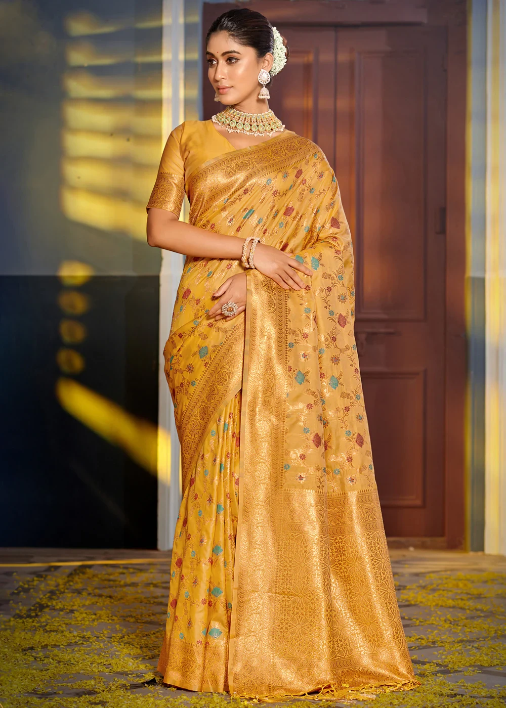 Crafted in Varanasi with intricate brocade weaving and luxurious zari motifs, this saree showcases royal elegance and timeless craftsmanship.